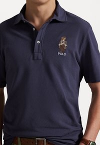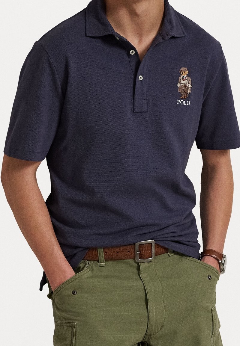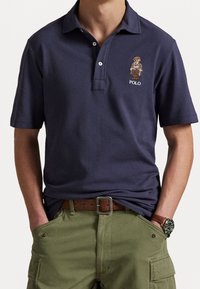 Homme portant un polo bleu marine avec un logo d'ours brodé, un pantalon cargo vert olive avec ceinture marron et une montre, mains dans les poches.