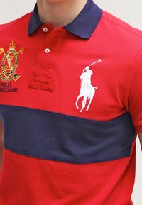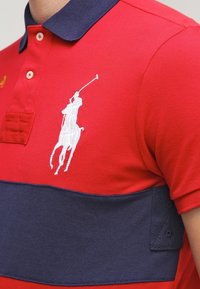 Polo rouge avec une bande horizontale marine, logo brodé et numéro sur la manche. Fabriqué en coton, il présente un col classique et trois boutons.