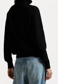 Pull col roulé noir en tissu doux, avec manches longues et coupe décontractée, associé à un jean en denim bleu clair.