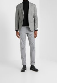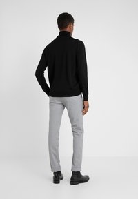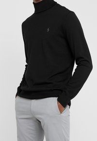 Pull à col roulé noir en tissu tricoté doux avec manches longues. Présente un petit logo brodé sur la poitrine. Associé à un pantalon gris clair.