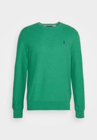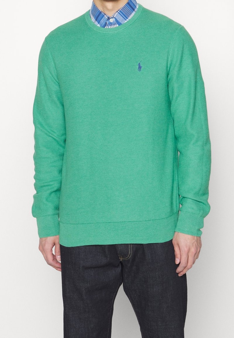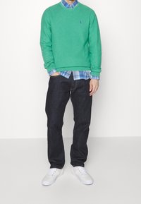 Homme portant un pull ras du cou vert par-dessus une chemise à carreaux bleue boutonnée, avec un jean foncé, debout devant un fond uni.