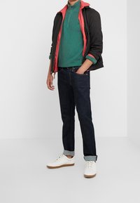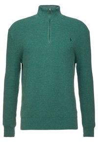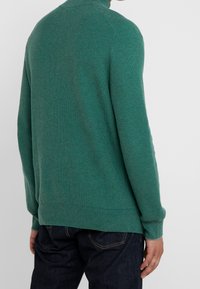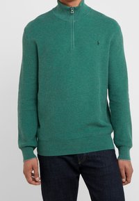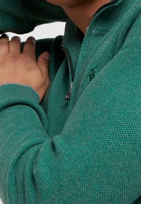 Homme portant un pull à col montant zippé d'un quart de tour texturé couleur sarcelle avec des poignets et un ourlet côtelés, associé à un jean bleu foncé.