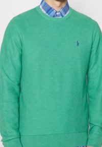 Homme portant un pull vert à col rond par-dessus une chemise à carreaux bleue, associée à un jean foncé, debout devant un fond blanc uni.