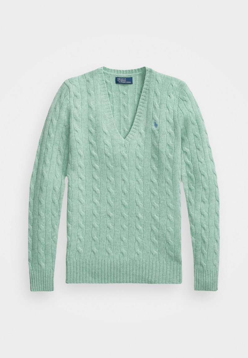 Pull vert clair à col en V en maille torsadée, manches longues avec poignets côtelés, avec un petit logo sur le côté gauche de la poitrine.
