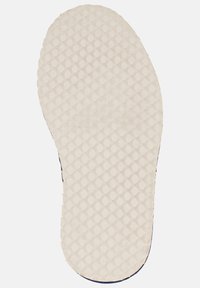 Chaussure lacée en cuir texturé bleu foncé pour homme avec des détails cousus et une semelle rayée en tons bleu, blanc et tan.