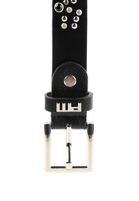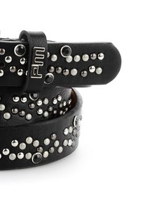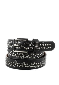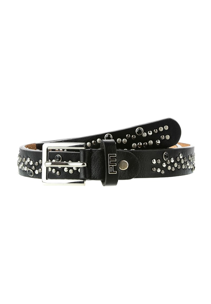Ceinture en cuir noir ornée de clous en argent et de strass, avec une boucle argentée et un logo PM sur la passante.