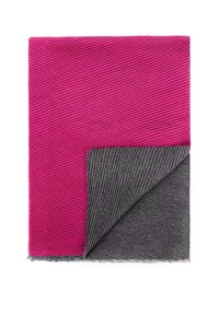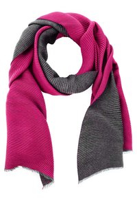 Écharpe côtelée enroulée en boucle avec des blocs de couleur gris foncé et magenta alternés, bords légèrement effilochés.