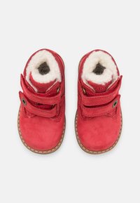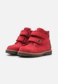 Botte pour enfant en daim rouge avec deux bandes Velcro, semelle marron, doublure en polaire et un logo circulaire noir sur le talon.
