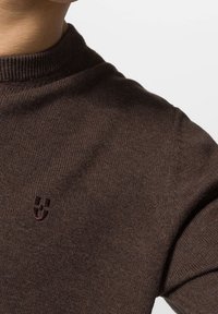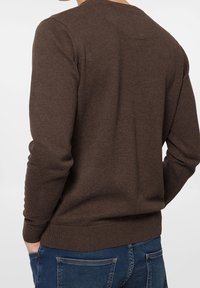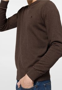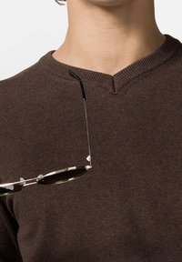 Personne portant un pull à col en V marron tenant des lunettes de soleil avec des verres ronds et foncés dans la main droite, sur un fond uni.
