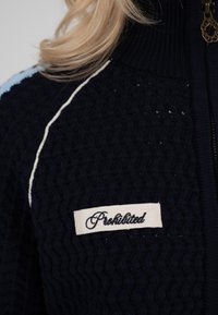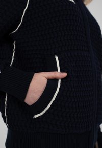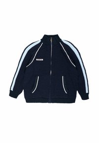 Veste zippée marine avec un motif en tricot texturé, accents bleu clair et blancs rayés le long des manches, et poches avant. Comporte un patch logo sur la poitrine.