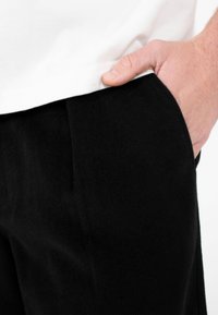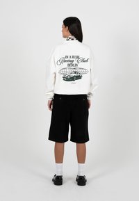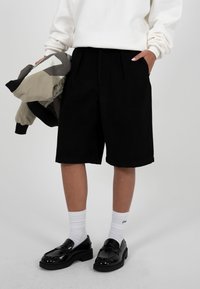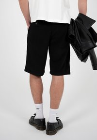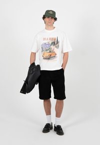 Homme portant un short noir, des chaussettes blanches, des mocassins noirs à pampilles, un t-shirt blanc avec un motif de voiture, tenant une veste en cuir noire dans une main.
