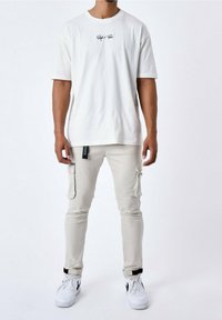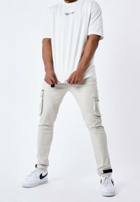 Pantalon cargo beige avec poches latérales, coupe slim, en coton. Porté avec des baskets blanches avec des accents noirs.