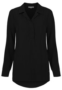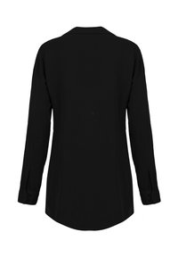 Blouse noire à manches longues avec col, patte de boutonnage cachée à l'avant et ourlet arrondi, conçue pour une coupe décontractée.