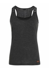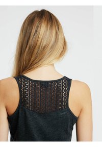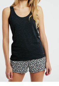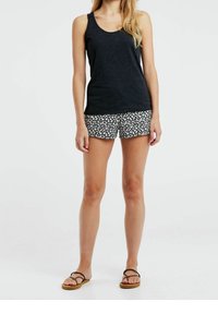 Débardeur noir sans manches avec un col rond, associé à un short à imprimé floral en noir, blanc et rose. Texture lisse, design décontracté.