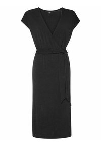 Robe noire mi-longue en wrap avec des manches courtes, décolleté en V, ceinture à nouer à la taille et fente sur le côté. Tissu texturé avec un motif subtil.