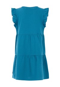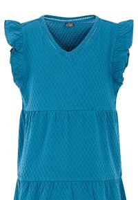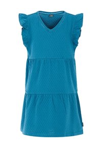 Robe en tissu bleu texturé avec manches courtes volantées, col en V et jupe à étages, conçue pour les enfants.