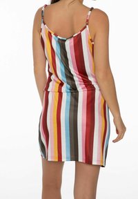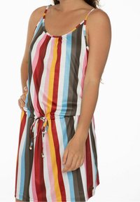 Robe à rayures multicolores avec taille à cordon, bretelles spaghetti et coupe décontractée, associée à des tongs marron.