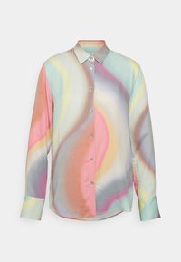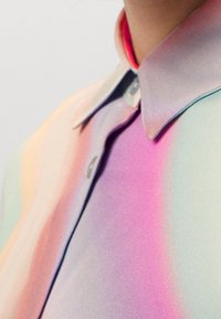 Chemise à manches longues en tissu lisse avec des tourments pastel de rose, bleu et jaune. Inclus un col pointu et une fermeture à boutons à l'avant.