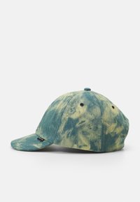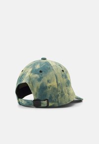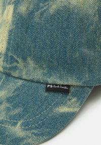 Casquette de baseball bleu et beige à motif tie-dye avec une visière incurvée, un bouton sur le dessus et une petite étiquette noire sur le bord avant de la visière.