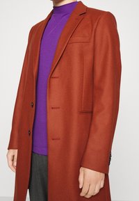 Homme portant un manteau trois boutons orange brûlé sur un pull violet et un pantalon gris foncé, debout devant un fond uni.
