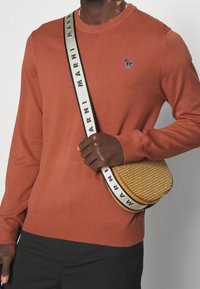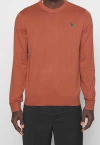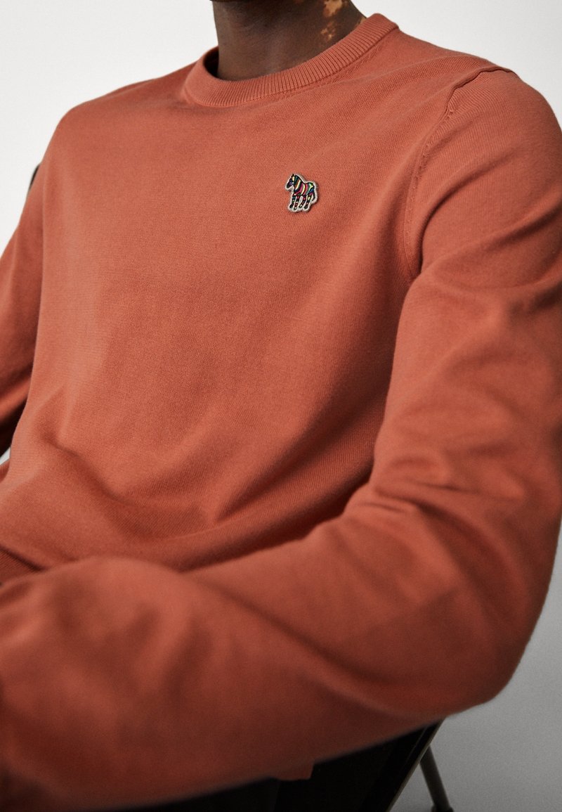 Homme portant un pull couleur rouille avec un petit écusson zèbre multicolore sur le côté gauche de la poitrine, assis devant un fond uni.