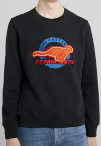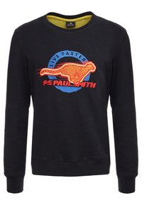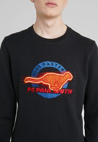Sweat-shirt noir avec un motif circulaire brodé coloré représentant un dinosaure à motif léopard et les textes « Live Faster » et « PS Paul Smith ».
