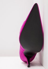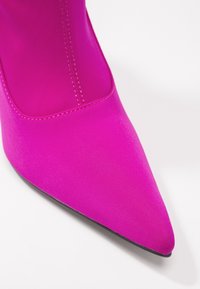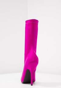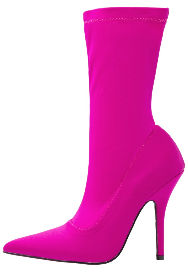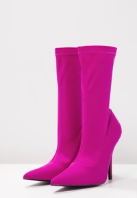Bottines fuchsia avec un bout pointu élégant et un talon aiguille haut. Fabriquées en tissu lisse et extensible avec un design sans couture.