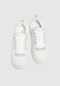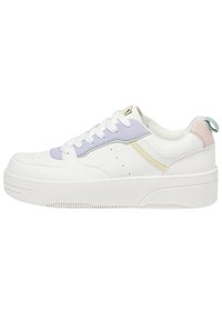 Baskets blanches avec une tige en cuir lisse agrémentée d'accents lavande, jaune et rose. Semelle épaisse en caoutchouc avec une prise texturée.