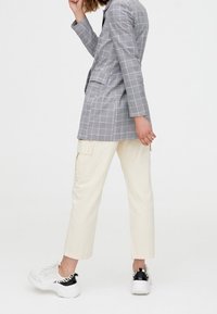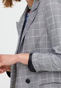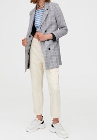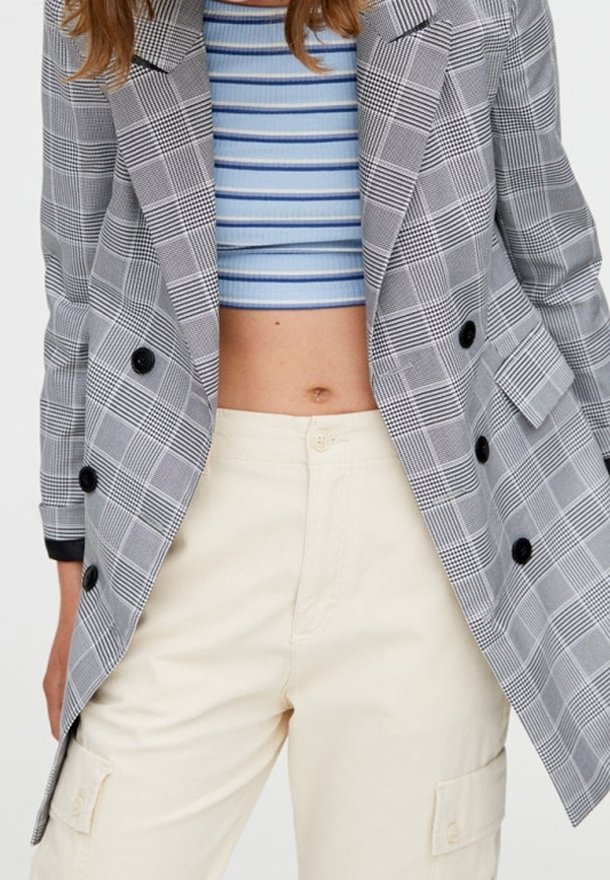 Blazer croisé à carreaux gris et noirs avec boutons noirs, associé à un crop top rayé bleu clair et un pantalon cargo crème.