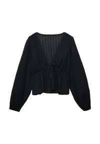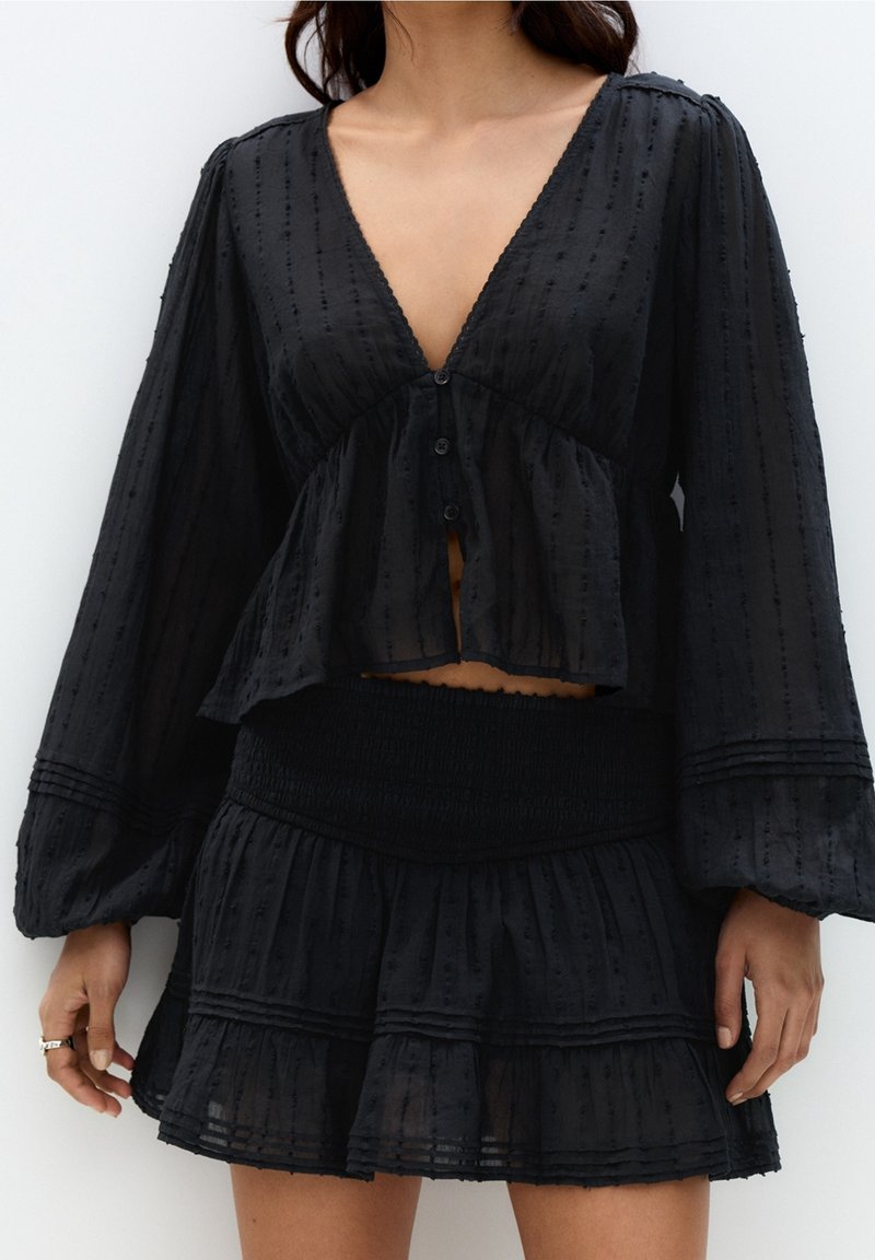 Femme portant un chemisier noir à manches longues boutonné et une mini-jupe à volants assortie avec des détails en tissu texturé.