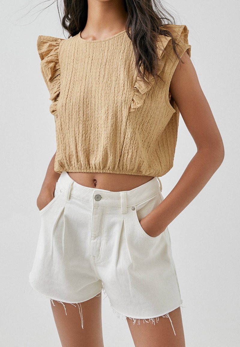 Femme portant un haut court sans manches beige texturé avec des épaules à volants et un short en denim blanc taille haute avec des ourlets effilochés.