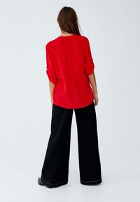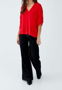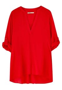 Blouse légère rouge avec un col en V et des manches retroussées. Texture lisse, coupe décontractée et ourlet arrondi.