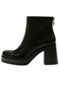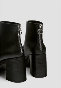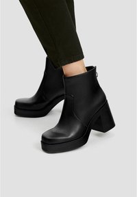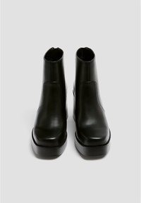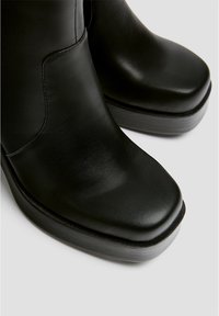 Bottines à plateforme en cuir noir avec talons carrés portées avec un pantalon noir sur un fond gris.