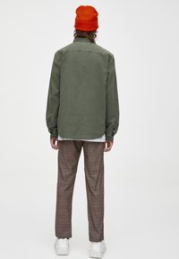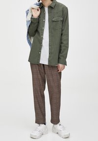 Homme portant une chemise boutonnée vert olive avec poches poitrine à rabat et un pantalon à carreaux marron, se tenant devant un fond uni.