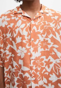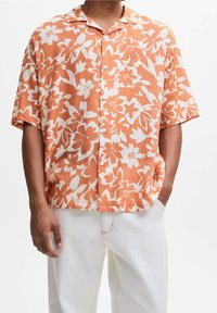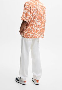 Homme portant une chemise à manches courtes à fleurs orange et blanche, boutonnée, associée à un pantalon blanc, debout les mains dans les poches.