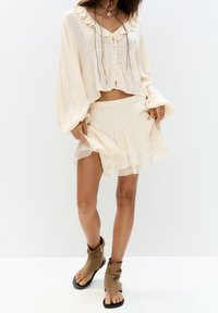 Blouse courte légère couleur crème avec encolure à volants, fermeture à boutons et manches longues, associée à une jupe à volants ornée de dentelle.