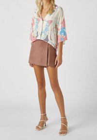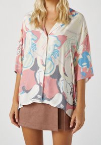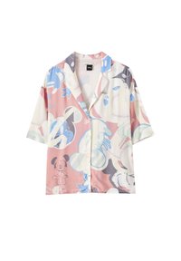 Chemise à manches courtes oversize en tissu léger, présentant un mélange de motifs abstraits roses, bleus et gris avec une fermeture à boutons sur le devant.