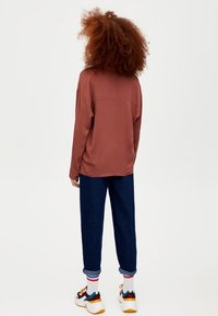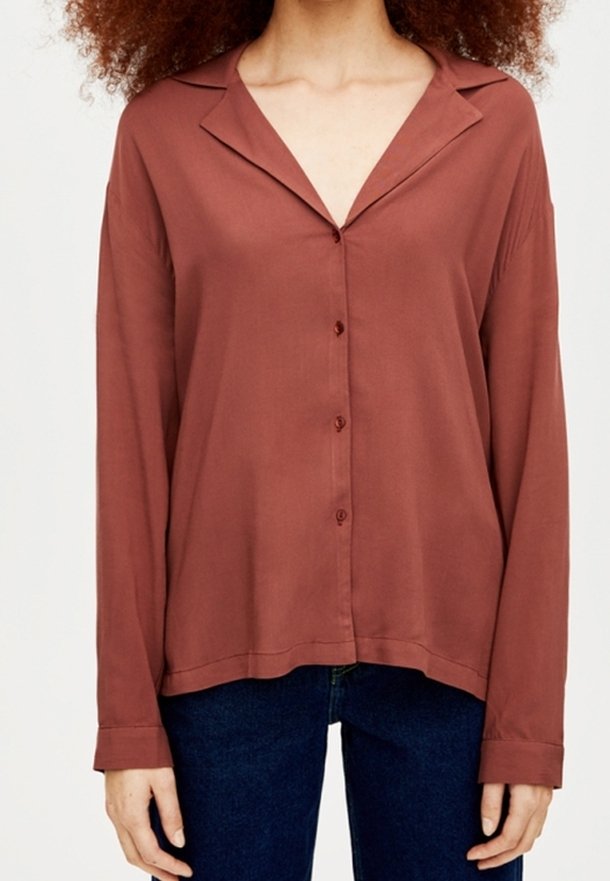Femme portant une chemise ample couleur rouille à boutons avec un col large et un jean bleu foncé, debout devant un fond uni.