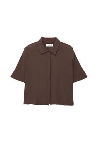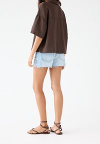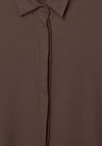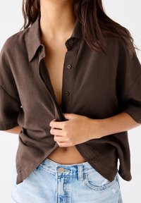 Femme portant une chemise boutonnée marron foncé et un jean en denim bleu clair, tenant la chemise partiellement ouverte à la taille d'une main.