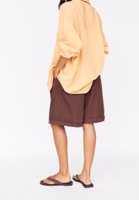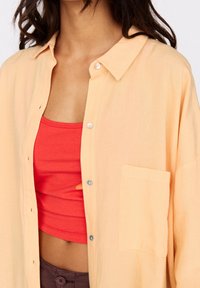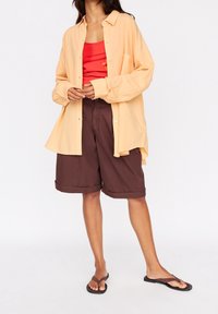Femme portant une chemise ample couleur pêche boutonnée sur un haut court rouge à motifs floraux, associée à un short marron taille haute mi-longueur, une main dans la poche.