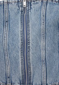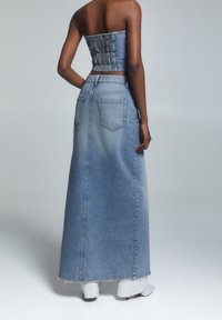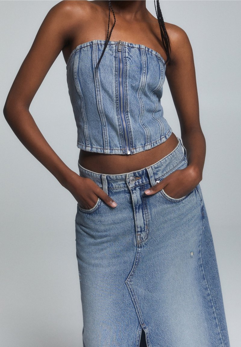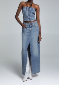 Top en denim cropped sans bretelles, bleu clair avec des coutures verticales, associé à une jupe en denim taille haute avec une fente avant et des poches.