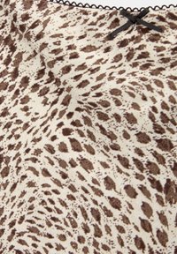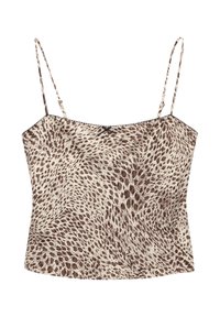 Camisole à imprimé léopard avec des bretelles fines, présentant une base beige ornée de taches noires et brunes, fabriquée en tissu texturé.