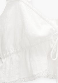 Femme portant une tenue blanche composée d'un crop top à volants noué devant et d'une mini-jupe à plusieurs couches avec bordure en dentelle.
