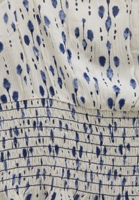 Femme portant une mini-robe blanche sans manches avec des motifs bleus, une taille froncée et des liens à pompons, se tenant debout avec des cheveux bouclés visibles.