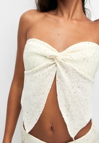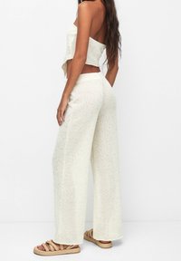 Femme portant un haut blanc texturé sans bretelles avec un nœud à l'avant et un pantalon large assorti sur un fond uni.