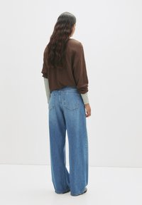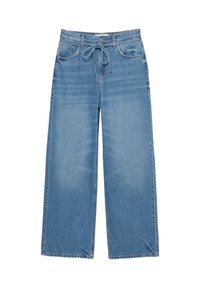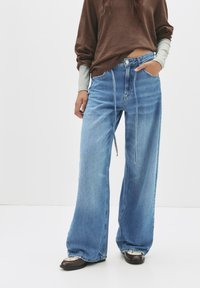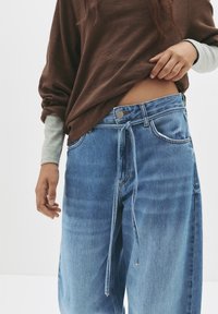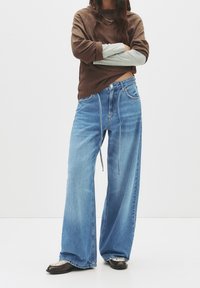 Jean bleu clair à jambes larges avec une taille haute, doté de poches avant, d'une fermeture éclair et d'un détail lacé. Porté avec un haut marron oversize.
