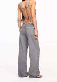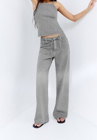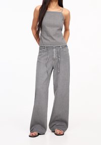 Jean gris à jambes larges taille haute, avec fermeture à boutons et poches avant, assorti d'un haut gris sans manches.