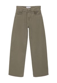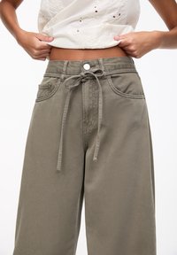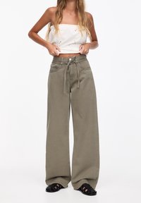 Femme portant un pantalon large vert olive avec une taille nouée, un haut court blanc et des sandales noires à bout ouvert sur un fond blanc.