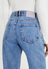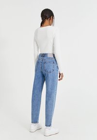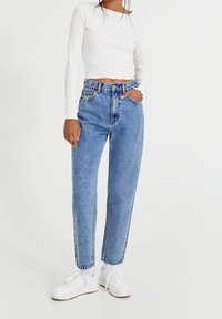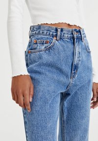 Jean en denim bleu taille haute avec un léger effet délavé, coupe droite, cinq poches et fermeture à boutons. Porté avec des baskets blanches.