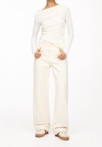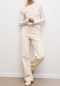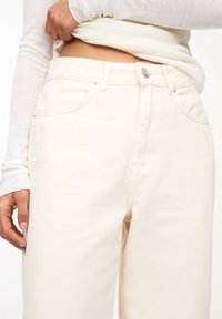 Jean en denim crème à taille haute avec une coupe évasée, dotés d'un design traditionnel à cinq poches et d'un bouton de fermeture à l'avant.